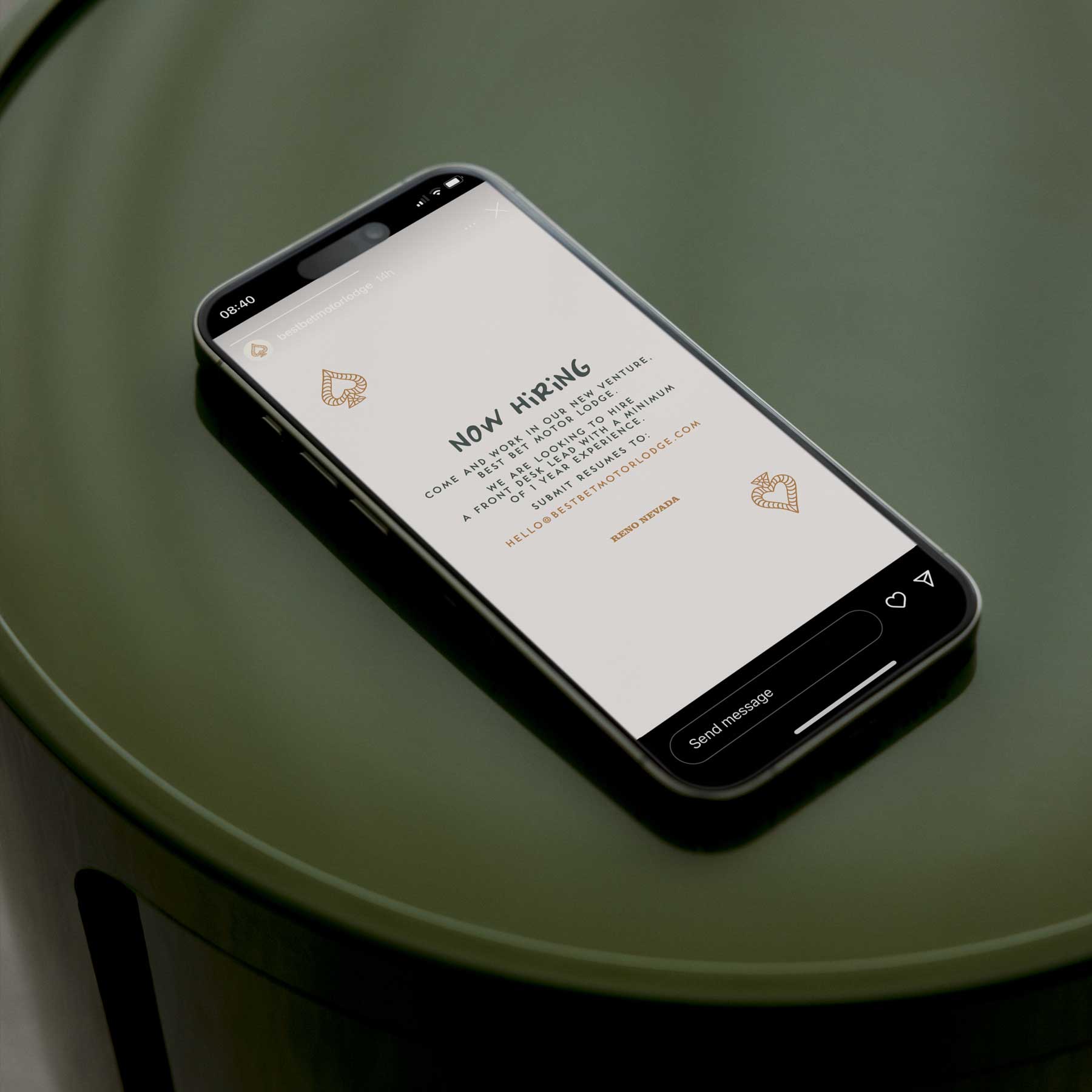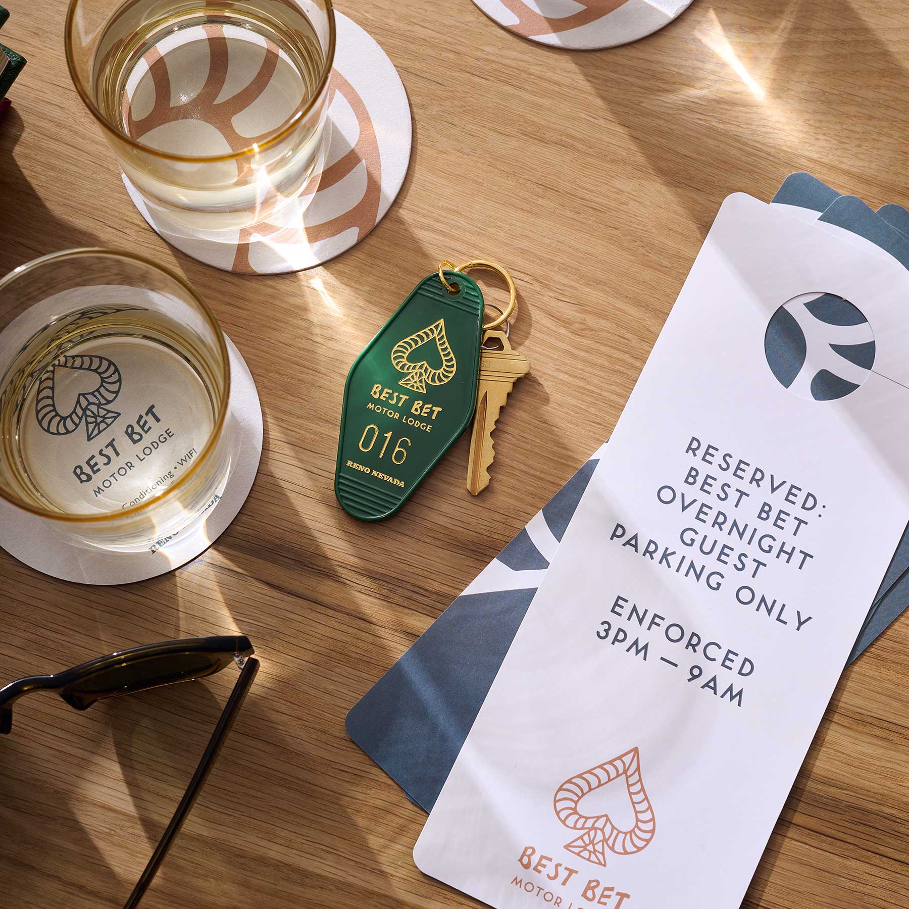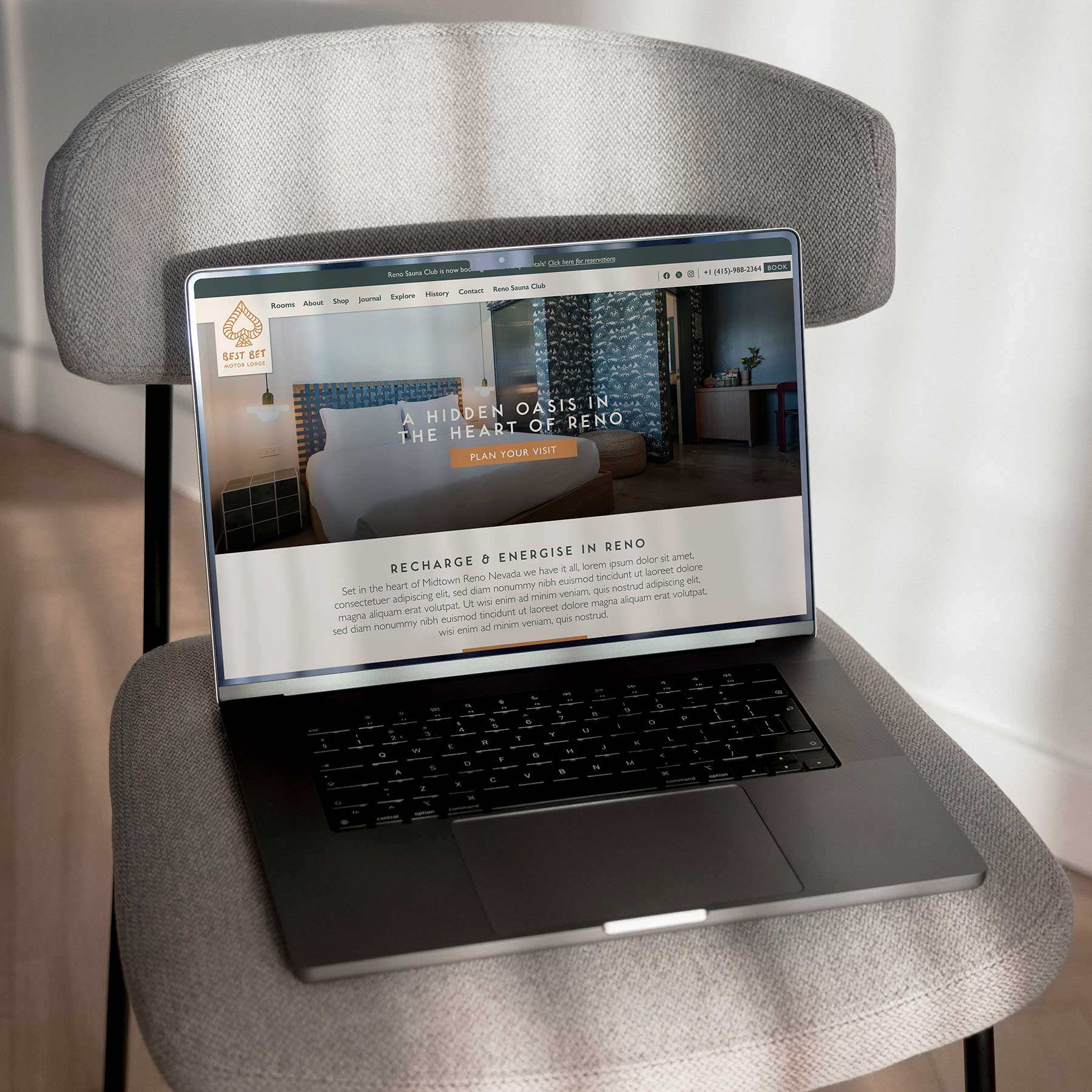 The primary challenges were to create a cohesive branding strategy that reflected the unique history and character of the Best Bet Motor Lodge while appealing to modern travellers. This included integrating subtle references to the number 21, reflecting the number of rooms, and incorporating elements of gaming to nod to Reno’s casino history. A key challenge was balancing the design aesthetic, ensuring it didn’t lean too heavily into retro references typically associated with motor lodges. Additionally, the team needed a powerful brand concept that would work seamlessly across various touchpoints, from hotel collateral and signage to social media, as well as a WordPress website integrated with the hotel’s operational systems. Ensuring that Reno Sauna Club branding complemented the hotel’s identity, while still being distinct enough to stand alone, was another critical element of the project.