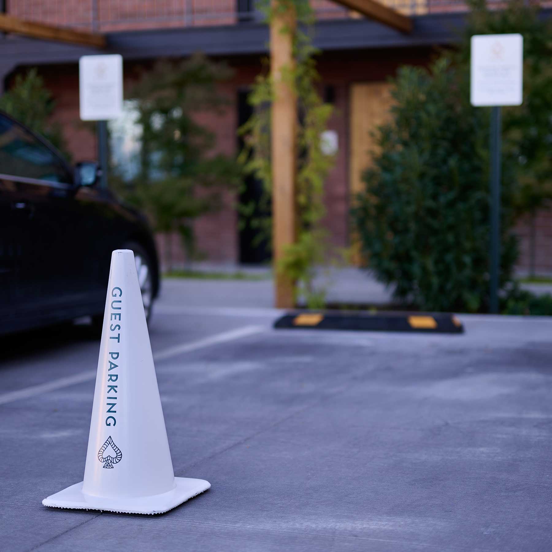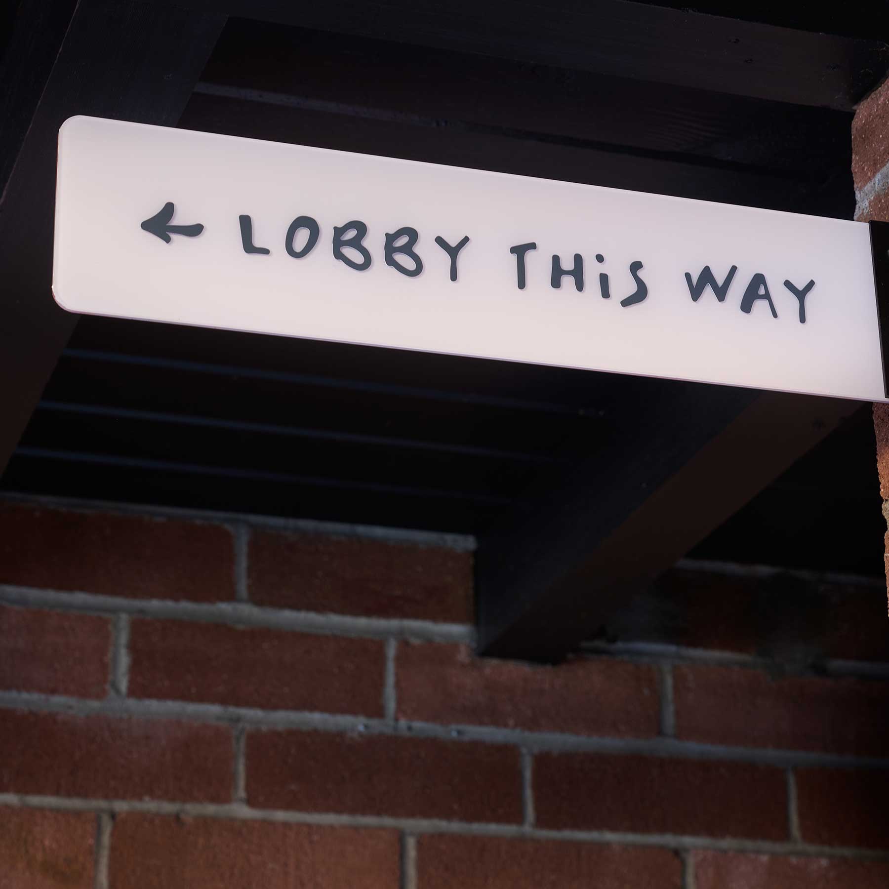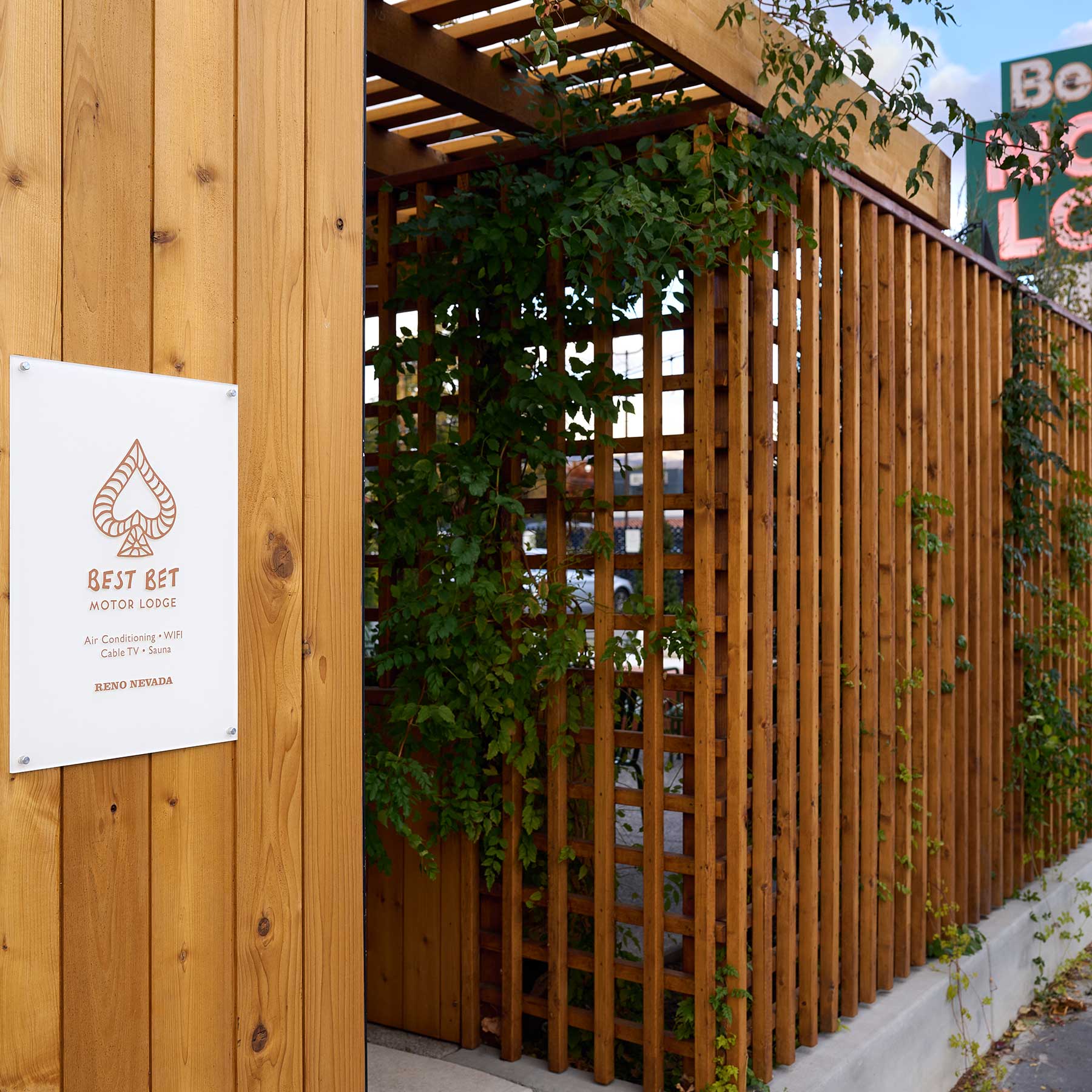 The guest journey was carefully mapped, guiding visitors from Best Bet’s parking lot and patio, through the firepit and lobby, into the traditional two-story motor lodge layout, and ultimately to the back of the property for access to Reno Sauna Club. A variety of signage styles—fascia, wayfinding, directional, identification, and regulatory signs—were used throughout, all adhering to ADA standards.