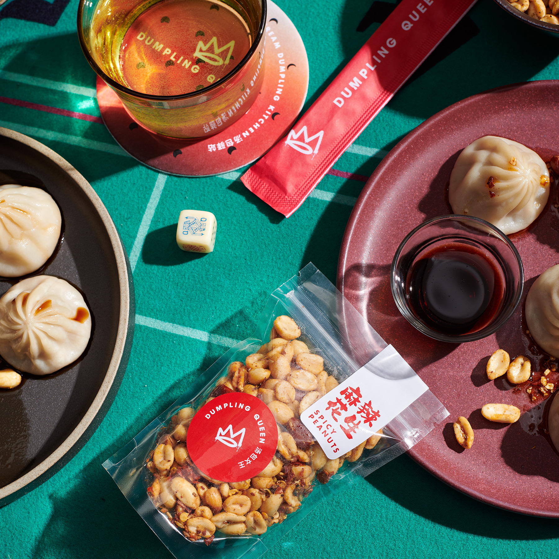 In China, the colour red is considered auspicious. It symbolises happiness, success, and fortune. This classic vivid red is the cornerstone of Dumpling Queen’s identity. Black and white help make the red sing for a beautiful, simple and unmissable colour palette. The logotype brings in a few Chinese characters, curved in the shape of a dumpling steamer and topped with a crown – of course. The crown’s sprayed effect bridged the gap between street food and street art. Traditional cross-stitched dumpling steamers inspired the texture and shapes of the brand assets, bringing togther an authentic Chinese and gritty Hong Kongese street experience.