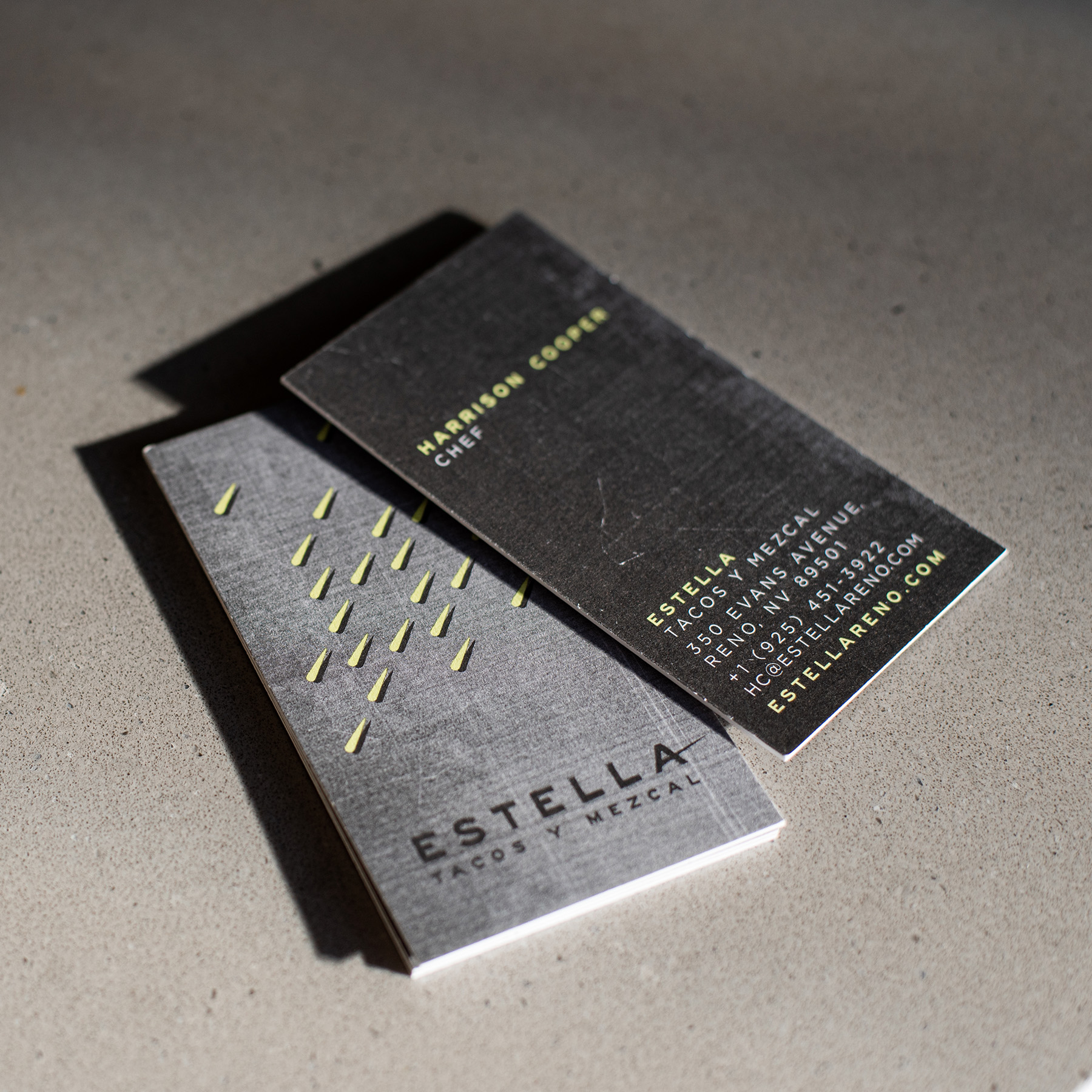 An electrifying neon yellow falling star forms the apex of the letter ‘A’ in Estella. It brings energy as it shoots across the menu. It forms part of a meteor shower when it needs to pack a punch. Overlaid across a muted palette, it’s vivid, modern and playful without being overdone.